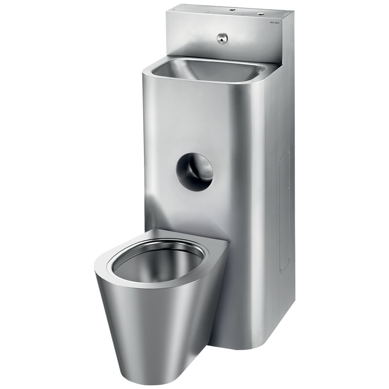 Le WC est entièrement soudé au lavabo, pas de vis : facilite le nettoyage et empêche la dissimulation d’objets.