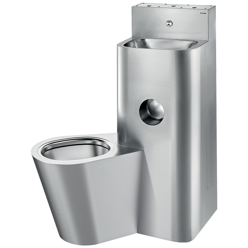 Le WC est entièrement soudé au lavabo, pas de vis : facilite le nettoyage et empêche la dissimulation d’objets.