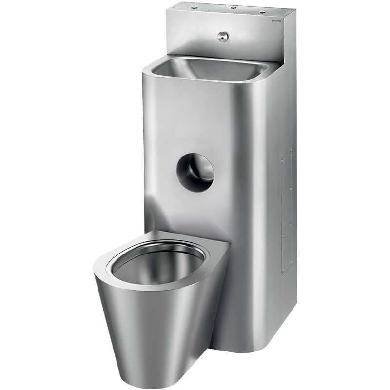 Le WC est entièrement soudé au lavabo, pas de vis : facilite le nettoyage et empêche la dissimulation d’objets.