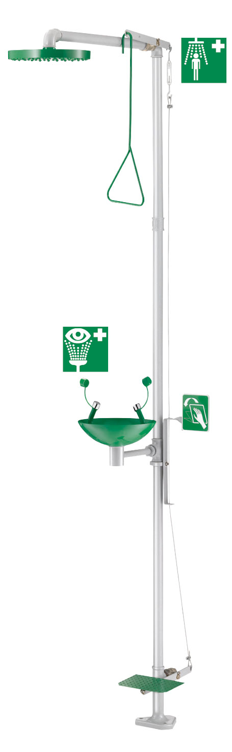 Réf. 9203Combiné de douche et lave-yeux de sécurité sur colonne à commandes manuelle ou au pied équipé de :