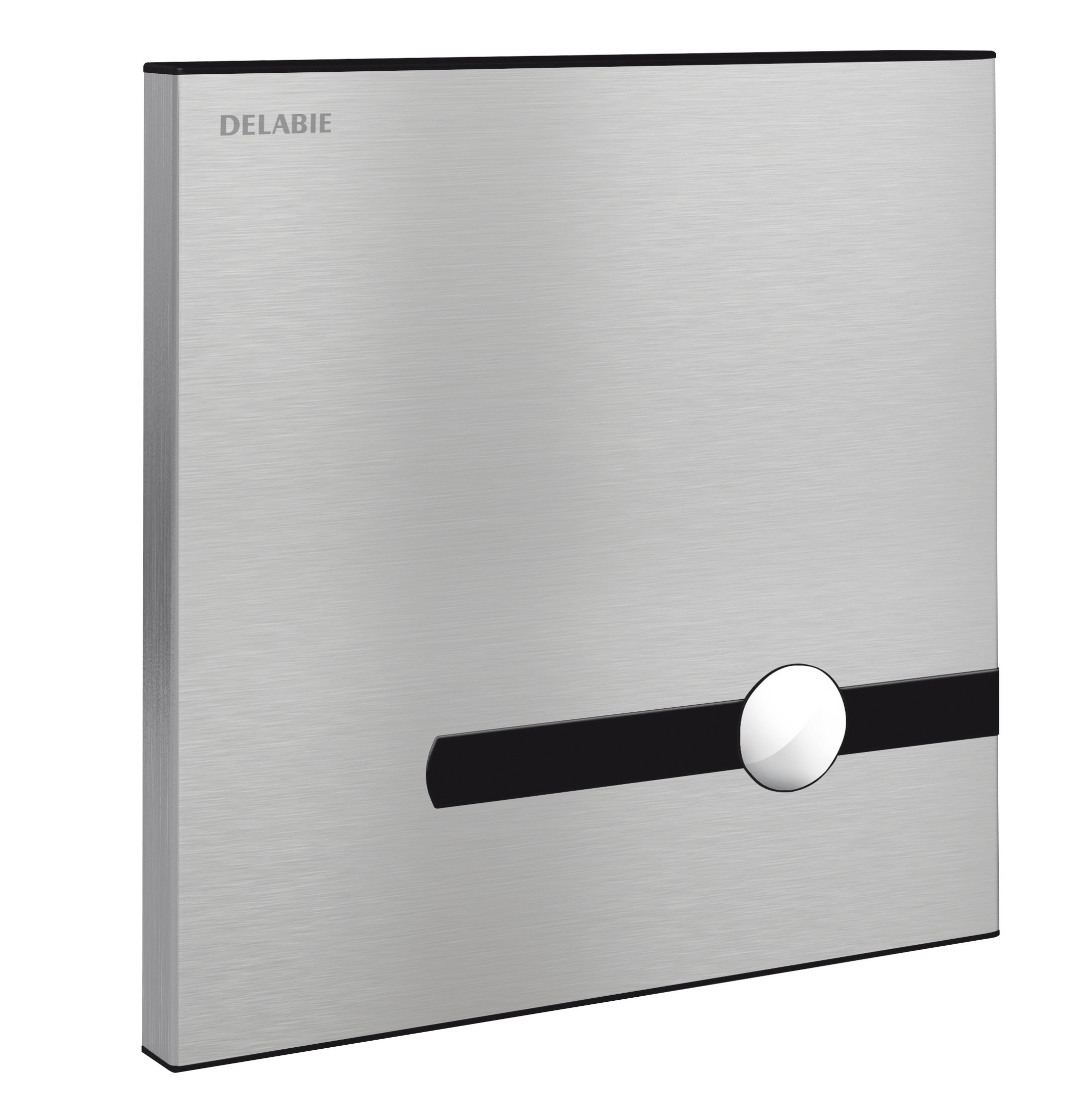 Afwerking plaat in mat gepolijst rvs en drukknop in verchroomd metaal.