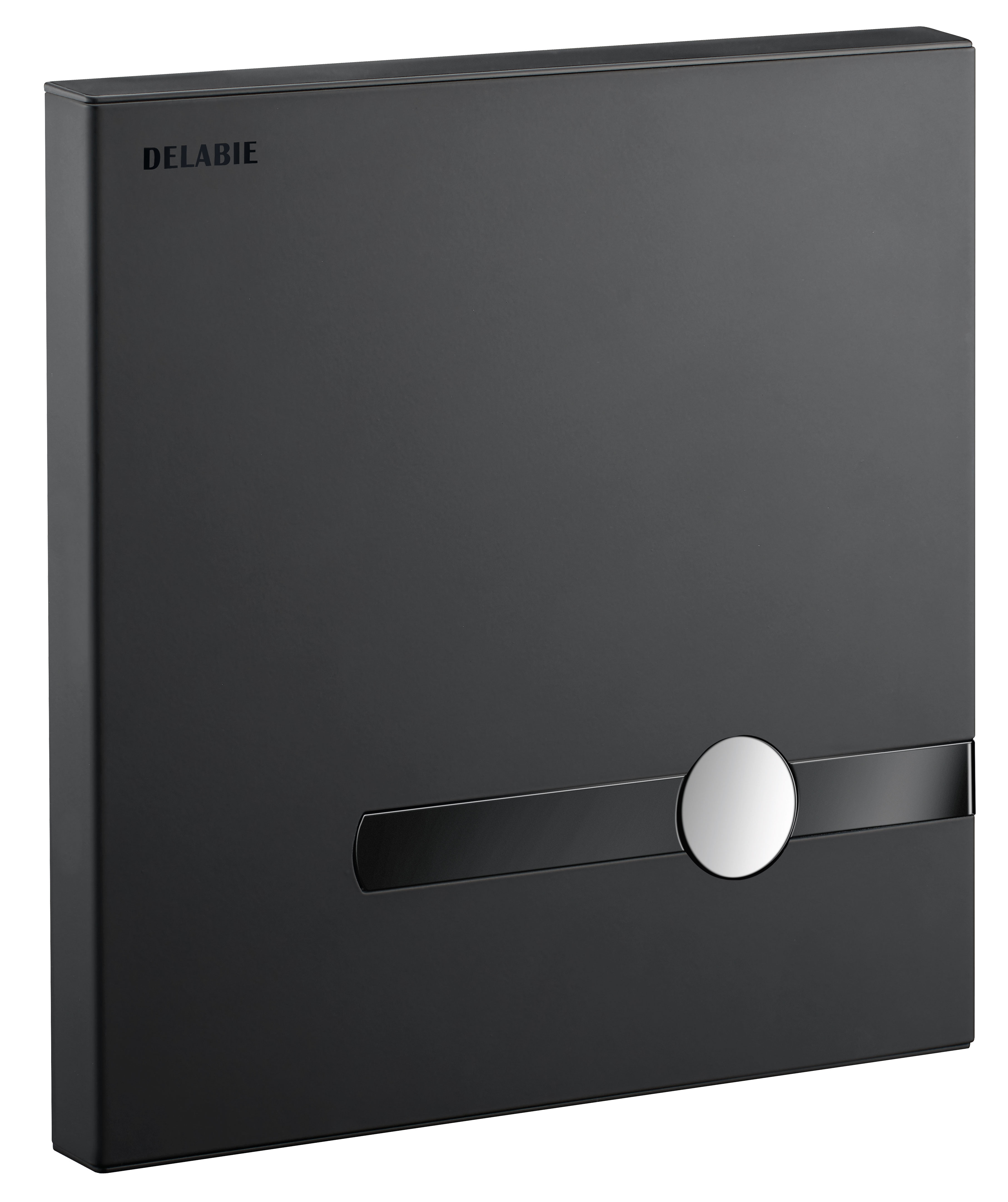 Plaat in mat zwart rvs 186 x 186 mm en drukknop in verchroomd metaal met geïntegreerde elektronica.