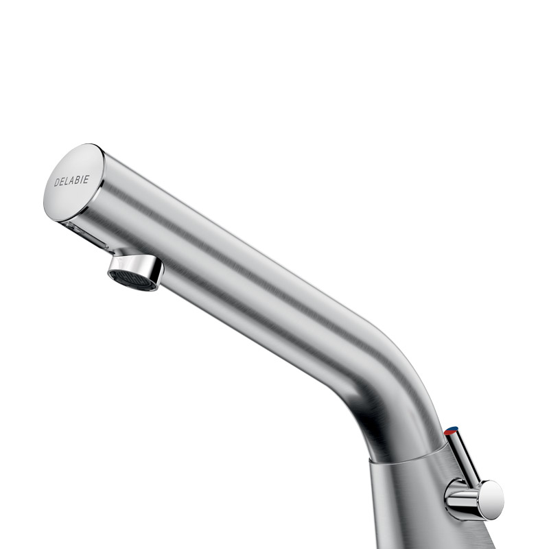 Elektronische wastafelmengkraan in mat gepolijst rvs op blad: