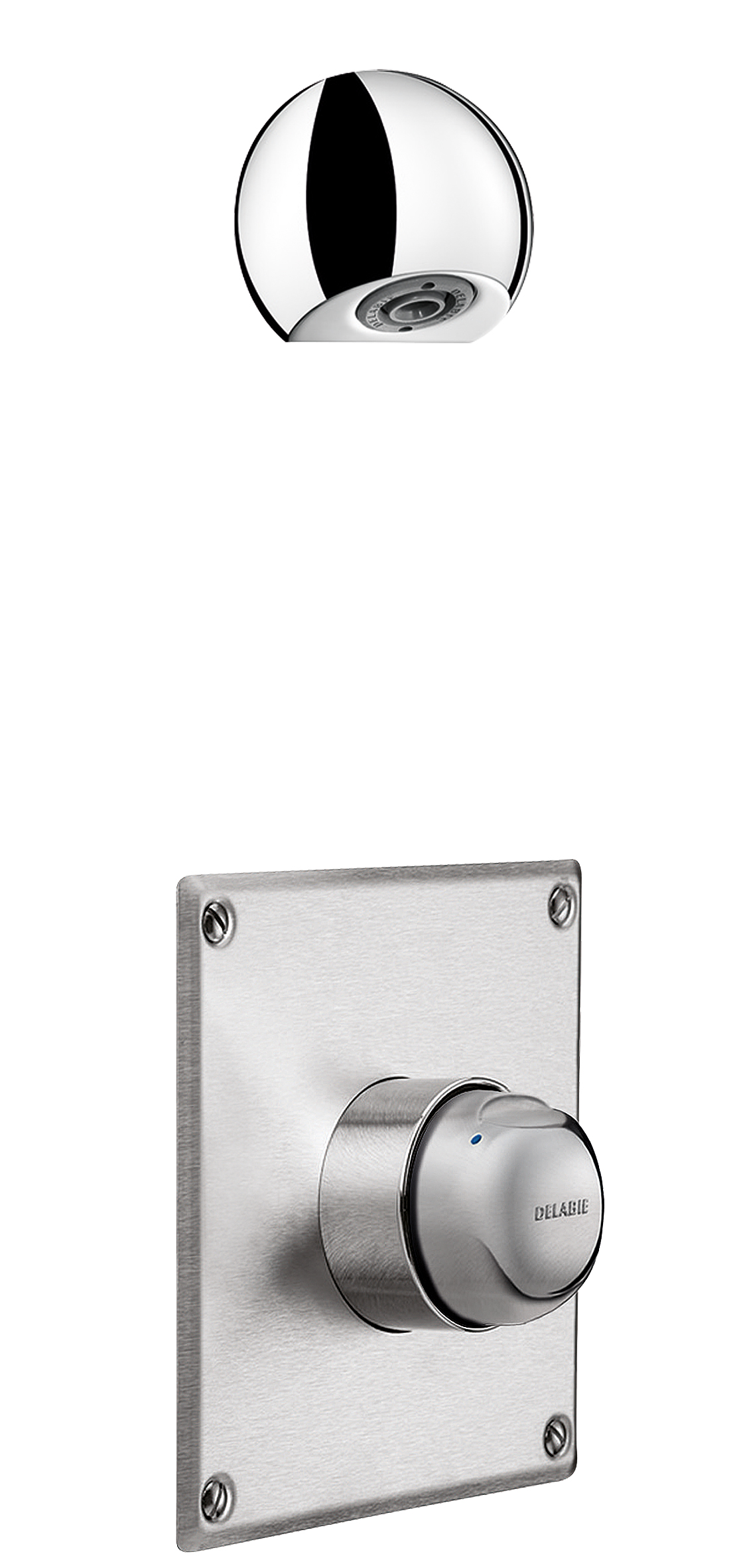 Verchroomde, vandaalbestendige en kalkwerende hoofddouche ROUND met automatische debietregeling.