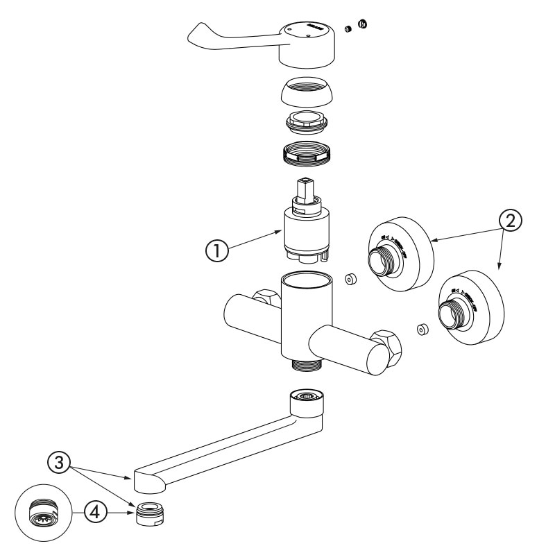 Mengkraan met asafstand 150 mm geleverd met STOP/CHECK S-koppelingen M1/2" M3/4" perfect aangepast aan de noden van ziekenhuizen.