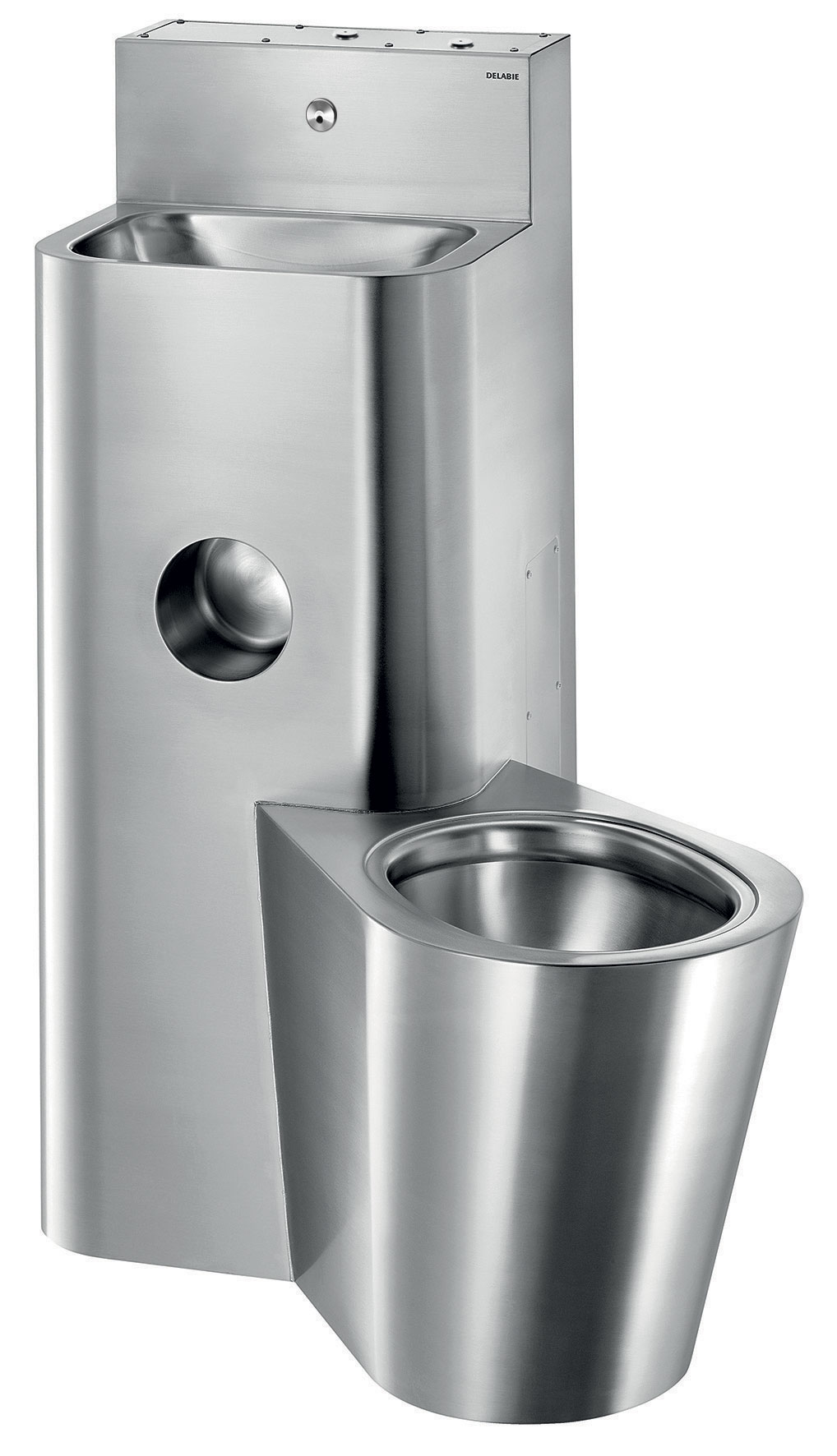 Het toilet is volledig gelast aan de wastafel, geen schroeven: vergemakkelijkt het reinigen en verhindert het verbergen van objecten.