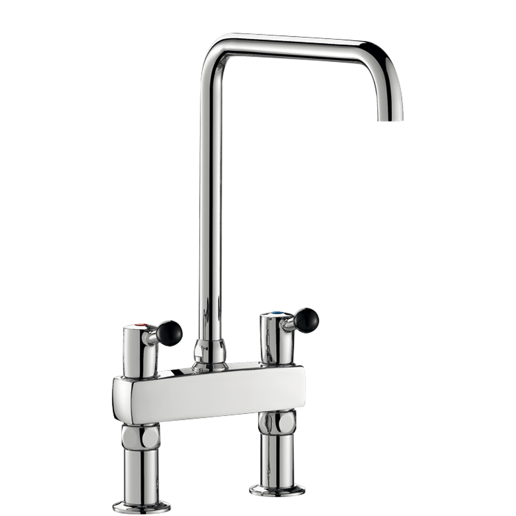 Ref. 5603Tweegats mengkraan op blad M3/4" met asafstand 150 mm, op rechte verhoogstukken voor grote spoelbakken.