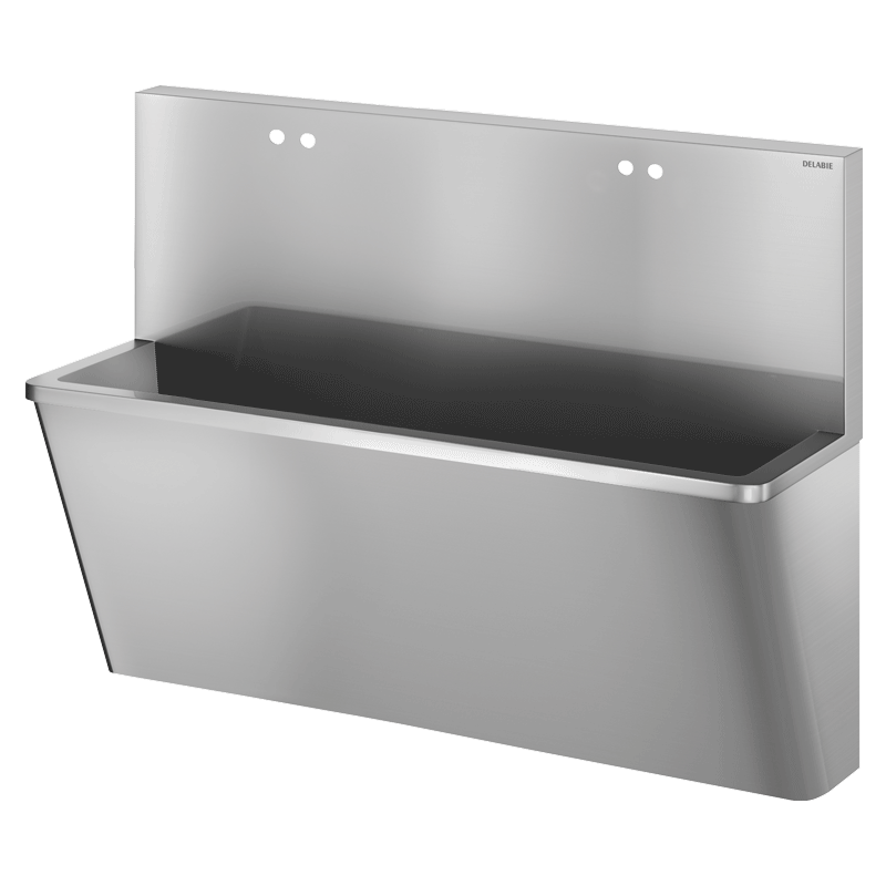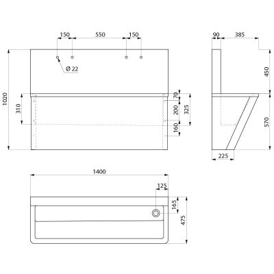 L. 1400 mm, 2 postes. Avec 4 trous de robinetterie Ø 22 entraxe 150.